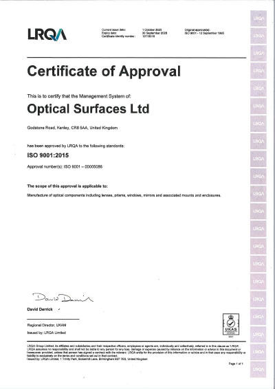 Optical Surfaces Ltd’s ISO 9001-2015 approved manufacturing facility provides the flexible resources to supply from single specialist requirements to OEM quantities. All high precision optics are provided with a complete quality test assurance report. To ensure the contamination-free status of its high precision optics – Optical Surfaces clean room facility enables elimination of airborne contaminants from the company’s final assembly and inspection area, thereby guaranteeing the highest quality product is delivered to its customers.